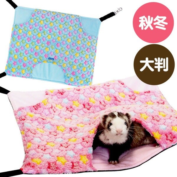 【もこもこボアのスリーポケット】は、ポップでかわいい星柄のもこもこボアで作られたフェレット用ハンモックです。
