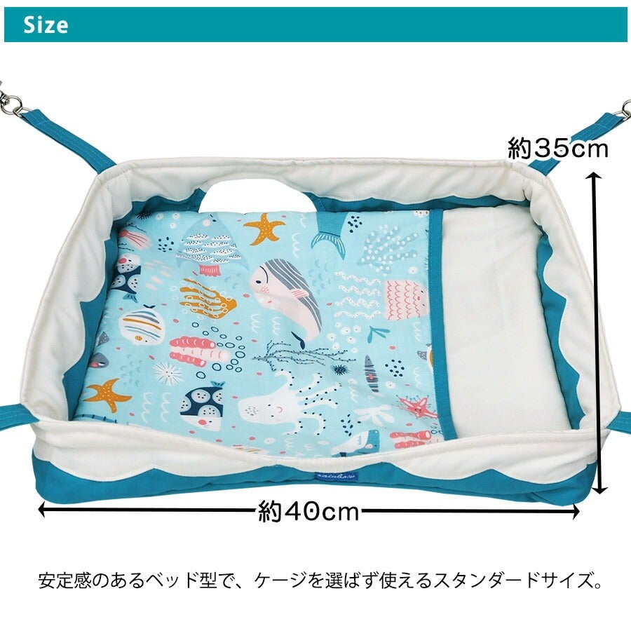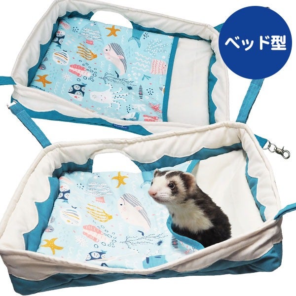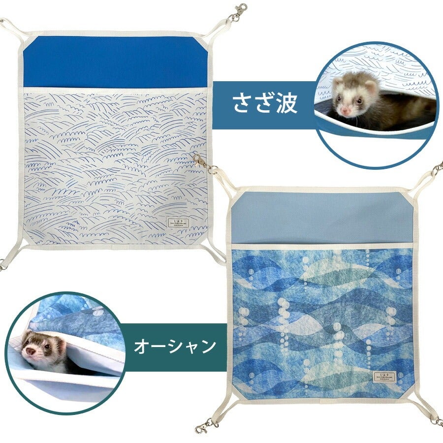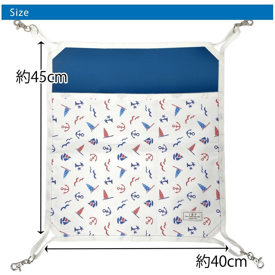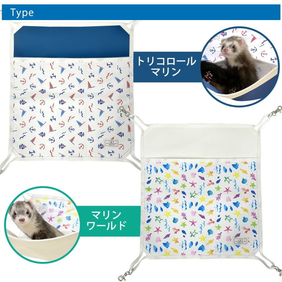 丈夫さと通気性が特徴の綿帆布に、夏らしいマリン柄をプリントしました。フェレットの習性である地面掘りにも負けず、易々とほつれません。 |