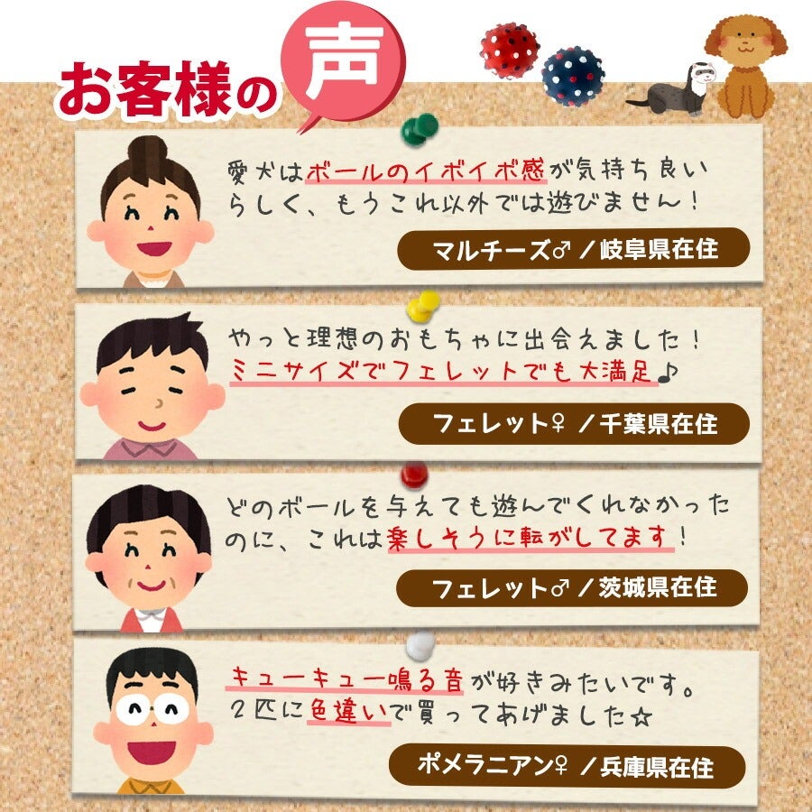 コロコロと転がるボールトイはペットの好奇心をくすぐります。 鈴入りの物や、中におやつを入れられる物など、様々な種類があります。 |