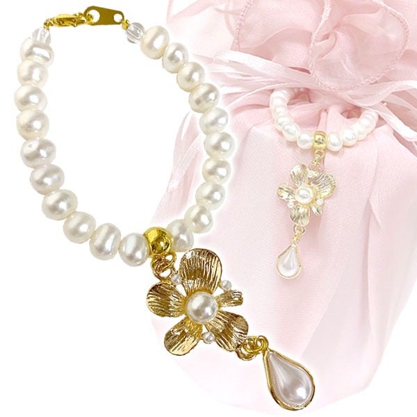 ・花びらには水滴を思わせる小さなパールと、揺れるしずく型のパールがより一層愛らしさを引き立てます。